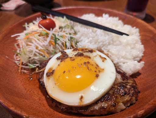 ハンバーグは基本的な物に数種類のトッピングが選べます。中にポテサラやチーズなどが 包まれた物もあります。お箸で食べるスタイルになっていて、お箸で食べるのにちょうどいい 弾力です。基本のソースが変わっていて、しょうゆベースのキノコの香りあふれるものになって ます。お箸のスタイルも含め、全体的に「和」にこだわっているようです。