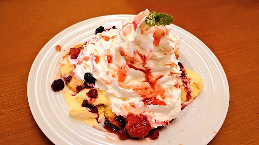 Read moreあー、やらかしてしまった(^^; 美味しそうなパンケーキの写真に釣られて入店したのですが、お食事メニューも豊富でついつい、食事とパンケーキを頼んだら、なんともパンケーキがボリューミーでパンケーキを残す結果となってしまいました。ほんと、申し訳ないです…私の外食の心得その1は料理は作って下さった方に失礼のないよう、完食厳守!なのに。後でメニューを見返したらカフェセットというお得なのがありました。 桜エビのチャーハンがピンクで美味しくて可愛かったです。接客も良...