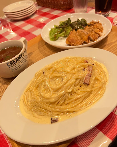 (๑•̀∀•́ฅ ✧トキハの商品券使える点は、すごく嬉しいです。連休に使おうと商品券を持っていくも、飲食店で使えるお店が少なく(しかも、いちいちHPを確認しなくては使えるか分からない)さまよっていた所、こちらの店長さん?が、「( ^ω^ )どうぞ! 商品券使えますよ♪すぐお席準備致しますね」と声をかけてくれました。2人で行ったにもかかわらず、4人席に通してくれたり 気を遣って下さったのがとても印象的でした。エビガーリックチャーハンは、想像したよりも かなり美味しくて、大盛りメニューがあったら···と思った程です。ピザもかなりクリスピーな生地にチーズたっぷりでペロリでした。見た目のインパクトでハニートースト(1斤)選びましたが、上を食べると下半分が味なしになってしまい、かなり後悔。この大きさ·料金でアイス1個は···追いハチミツ出来るとかバター付けてくれるとかして欲しい感じです。(ハーフがおすすめ。ハーフでもアイス1個乗ってます)(作り手にもよるのかも?) お店自体の印象は、他の口コミにも書かれていた様にやや暗い雰囲気。(ビニールのテーブルクロスがダサいせいかな?なんて考えつつも··?!)...