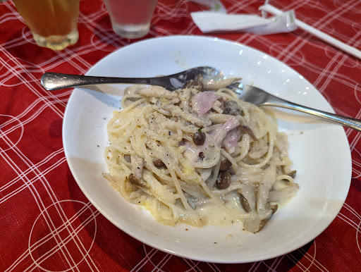 配膳された肝心のメイン料理の風味だが、生暖かく、食欲を掻き立てるニンニクなどの香りが無く、市販レトルトソースを、アルデンテ風の粉っぽい風味のパスタに絡めたものに思えた‼️