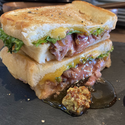今回僕が食べたのはローストビーフチーズメルト。ホットサンドにチーズとサラダ、そしてこれでもかというくらいぎゅぎゅうに挟んだローストビーフ。ソースはマヌカハニーマスタードソースがかかっています。