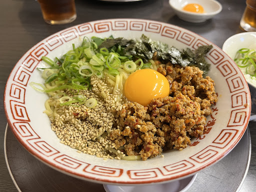 大分ラーメン探索でググって、美味しそうなラーメンを提供されてたので初見ですがこちらの店に入店しました。休日夕方は17:30からオープン、ちょうど時間過ぎてたので家族で一番入店。入店した店舗内左側に券売機があり、食券を購入し店員さんに渡して席に通されました。メニューは「とんこつラーメン」「とんこつしょうゆ」「2号ラーメン」「まぜそば」があり、サイドメニューで「チャーシューご飯」「白飯」「チャーハン」「餃子」がありました。今回は『まぜそば』を注文。注文して10分ほどして着丼。丼上には生黄身たまごが真ん中に、赤唐辛子が入ったそぼろ、刻みネギ、白胡麻、刻み海苔で覆われて綺麗な外観。ひと口そぼろを食べましたが、程よい辛みが口の中に広がります。その後黄身を潰して全体をあっさり混ぜていただくと、酸味が発現、丼下にタレとして入っていたようです。特段むせるような強い酸味ではなかった。最後によく混ぜ込んですすると、中太ストレート麺に具材がよく絡んでズルズルと口の中に入っていきます。赤唐辛子の程よい辛味そぼろ、タレの酸味、ネギ、海苔、味をマイルドにする黄身が程よくマッチングした大変美味しくいただけた『まぜそば』でした。この『まぜそば』は、最後に「おいメシ(ひと口白飯)」を頼め、丼下に残ったタレやそぼろと混ぜて食べると絶品、〆のご飯として大満足でした。サイドオーダーで注文した『チャーシューご飯』は白飯上にほぐしたタレ付きチャーシューとネギがのっており、ひと口食べましたが美味かった(ほとんどは息子に食べられた)。次回はまぜそばの辛さ調整やその他ラーメンに...