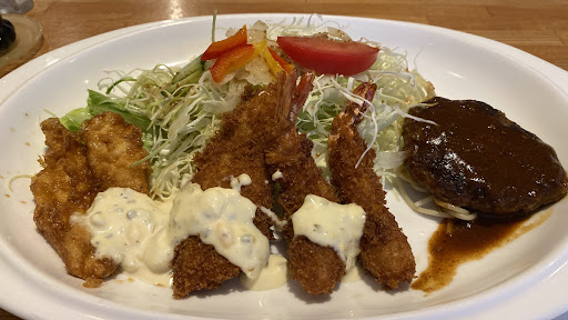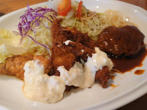 平日のランチ時に訪問。 店内はサラリーマンのお客さんで ほぼ満席。チキン南蛮が有名のようですが、他のメニューも食べたかったのでチキン南蛮と白身フライとハンバーグとエビフライが1個ずつ入ったAセットを注文。 チキン南蛮は衣にバジル?のような緑色をした隠し味が入っており、 上品だがジューシーな逸品。これは、確かに美味い。 白身フライは衣と身がフワフワで、口に入れるととろけるような食感で、こちらも贅沢な味わい。 ハンバーグとエビフライも安定の美味しさでした。 ご飯のおかわりが1杯まで無料なのが嬉しいですね。600円のランチでおかわりをしたら、かなりリーズナブルでは。 他の方も書かれてますが、セットの味噌汁が赤味噌でとても味わい深かったです。 食後のコーヒー、150円とは思えない美味しさでした。 写真の通り、他にドリンクメニューは無いです。 店内は外から見たら狭そうに見えますが、店の奥に更にテーブルが3個あります。コンクリート張りの店内で、静かな音楽も流れており、居心地の良い空間でした。 一つ、駐車場の台数が多い割に出入り口の電柱が邪魔で、枠線が斜めになっているので、少し停めにくいですね。...