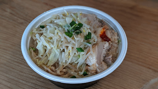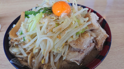 仕事で近くに二郎インスパイアの店があるとわかり訪店。 入口の発券機で好きなラーメンを選びます。この時に、二郎では定番のコール(野菜・脂・にんにく・濃さ)も一緒に選べます。 恥ずかしかったり、コールに抵抗がある人には良いかも。 私は初見なので太一盛りの大盛(麺1.5玉)で野菜増し脂多めニンニク無し辛めを選択。 周りのお客さんが食べてるのを見るだけでも美味しそうです。 券を持って中へ入ると笑顔が素敵なスタッフの方が案内してくれました。 太一盛りの玉子を味玉か生卵で選べるらしい。 これは良いサービスです。 ってか、色々乗ってて大盛850円。 本家よりコスパが良い。 九州は物価が安いからでしょうか。 凄いです。 指を咥えてラーメンが届くのを待ちます。(実際は咥えてません。汚いので) ラーメンがテーブルに来た時にスタッフの方が『野菜の盛りは大丈夫ですか?』と聞いてくれます。 なに!?更に増してくれるのですか? 迷う事なく増していただきました。 上に乗せられた生卵が行き場を無くしてしまい、横へ待避。 生卵は別皿でもいただけるそうです。 それでは、いただきます! が、生卵が気になり天地返しが出来ない笑 味の無い野菜を少し消化し、少しずつ引っくり返して行きます。 野菜を増々にしたせいか、少し味が薄くなりましたが美味しい。 麺も硬めでお願いしていたので、良い感じです。 煮豚を追加しておけば良かったなーと思いつつ、モリモリ食べ進み普通量を注文した同僚より早く食べ終わってしまいました。 いやー、美味しかったです。 お客さんが一杯入っているのも納得の味。 またお伺いさせていただきま...