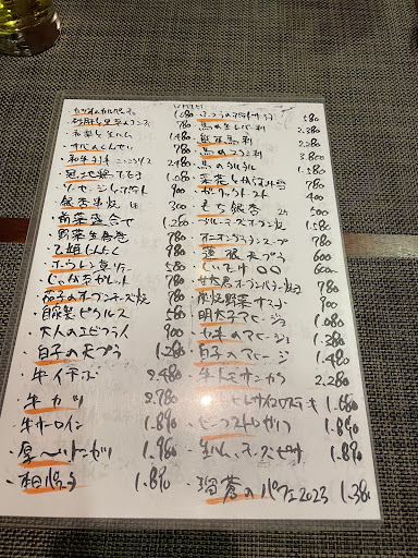 Read more知人に勧められ記念日に行きました。土曜ディナー予約なしで入りましたがほぼ満席。店内は邦楽が流れ、少しうるさい。と思いきや狭い店内、他のお客さんの声を遮ってくれるので居心地よしです。常連さんがメインな感じ。料理は絶品でした。 コース内容はメニュー表に記載がないのと、3500円~と書いてたので予算と好みなどで変化するのだ思います。銀杏の素焼きと栗チップス、ドリアは私的には普通に感じましたが、そのほかは全て驚きのある味付け食感で楽しく食事出来ました。店長とスタッフの感じも凄く良くて絶対にまた来ようと思いました。次はアラカルトで頼んでみようと思います。評判のトンテキを食べてみたいものです。(他のお客さんもアラカルトで頼んでたように見受けられました) この絶品料理をこの値段で食べれるとは大満足でした。料理の提供には時間がかかります。私は下記メニューで3時間ほどの滞在となりました。ゆっくり食事出来たので良かったです。 〇当日のコース内容(3500円×2人) ・イサキのカルパッチョ(1380?) ・銀杏の素焼き(400) ・栗チップス(500) ・砂肝とメークインコンフィ(780) ・シーフードカレードリア(1580) ・厚へいトンカツ(1980) ・チョコレートムース(450) ()内は参考に単品メニュー価格。イサキのカルパッチョは他のカルパッチョを参考までに記載。単品との量の違いは不明 〇単品メニュー ・スパークリングワイン2800円 ・その他ペリエ等のドリンク ・魚介アヒージョ ・たっぷり野菜のサラダ(琉蒼風)...