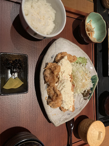 Read more2024.3.21 🅿️有り☆店内に入るとお店の方がお座敷を案内してくれました☆ このお店は予約をしてから来られる方が多いみたいてデス☆ 今回は平日限定メニューから揚げ出しとうふ定食と大海老と海鮮Mixフライ定食を注文☆ お茶や珈琲等の飲み物はセルフ☆ そこに一口サイズのケーキやわらび餅、ゼリー、ブラウニーなどのデザートはバイキング形式で自由に好きなものを選んで食べれます☆ しばらくすると料理が運ばれてきました☆ 私が頼んだフライ定食の大海老は衣サクサクで頭から全部美味しく食べれました☆ 揚げ出しとうふもピーマンや人参等の野菜も添えてあって味も良くてこちらも美味しかったデス☆ あとテイクアウトは単品なら出来るみたいでテイクアウト出来るものを教えて貰ってから揚げと天ぷらの盛り合わせを頼みました☆ 2人前で頼んだので...
