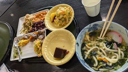 うどんと惣菜バイキング、賛否両論あるようですが、ご存じの方には「テレビ千鳥」の「一周だけバイキング」のようではあります。 すべてが食券制なので、みなさんが並んでいる中、後ろから狙いを定めて皿にうまく盛っていけば何も問題はありません。 最後にうどんが出ます。 唐揚げはバイキングの方に無かったのですが、途中でお姉さんから「よかったらどうぞ」と一つ皿に置いていただきました。 味は、うどんも含めて、九州らしい優しい甘さが特徴的です。 当日、剣道大会があったらしく、けっこうワチャワチャしていましたが、席もしっかりありますし、総合的にリーズナブルでお得な感じがします。 このあたり、出張でたまに行くことがあるので、今度はカフェメニューもた...