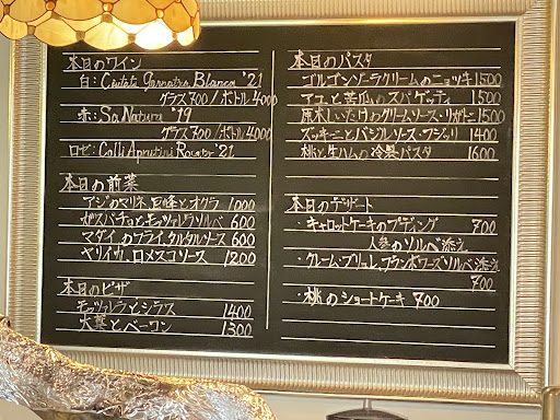 メニューはピザを中心にパスタなどもあり、非常に目移りします。ワインもこだわっている様子。おつまみになるメニューもありました。夜も来てみたいものです。本日のメニューも気になるものがいろいろ。メニューの中に「お客様とお店は対等」という趣旨の記載(別に偉そうな書き方はされていません)がありますが、全く同感だし、日本ではお客様は神様だとか金払う方が偉いんだと勘違いして調子乗ってるバカもそこそこいるので、ハッキリ明言しておくくらいが良いと思いますね。