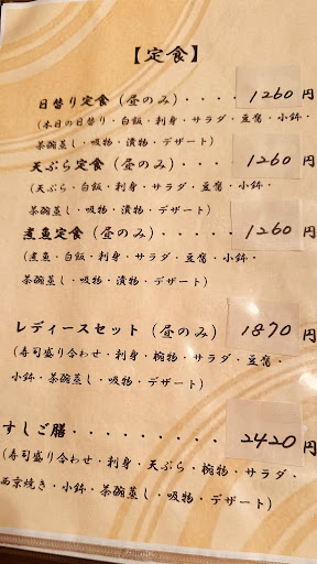 すしご膳(税込2,200円)をいただきました。 内訳はサラダ、小鉢、刺身、寿司盛り、椀物、西京焼き、天ぷら、茶碗蒸し、吸い物、デザートと価格の割に充分な内容となっております。 サラダはいくつもの野菜が使われており彩りもあり手抜き無し。 小鉢はゴボウとひじきの和え物。 刺身はサーモンとブリ。 メインの寿司盛りはさすがに料金のしわ寄せが来てて、握りがマグロ、サーモン、イカ、エビ、巻きはかっぱ×3、しんこ×3、少し長めのカニカママヨ×2。 安っぽいラインナップではありますが、全体の構成と料金を考えればやむなしだが量的に満腹度は得られるという工夫なのでしょう。 巻き寿司の海苔はパリッとしてて作り立て感がありGOOD。 椀物は餅風の何かと何かを加えたものを何かで包んでる煮物という、得体がさっぱり知れないモノでしたが美味しかったです。 西京焼きはやはり価格的に一切れ構成。 寿司が供された直後に、それ以降のすべての料理が出されていたので、天ぷらに手を付けた時点ですっかり冷めてしまっていましたので食感もよろしくなく、天つゆにドップリ浸けて食べました。 茶碗蒸しも小さいものの具沢山でしたが冷めてて同様。 吸い物は鯛の具入りでしたがこれも冷めてます。 最後の自家製っぽいマンゴープリンは業ありの一品。