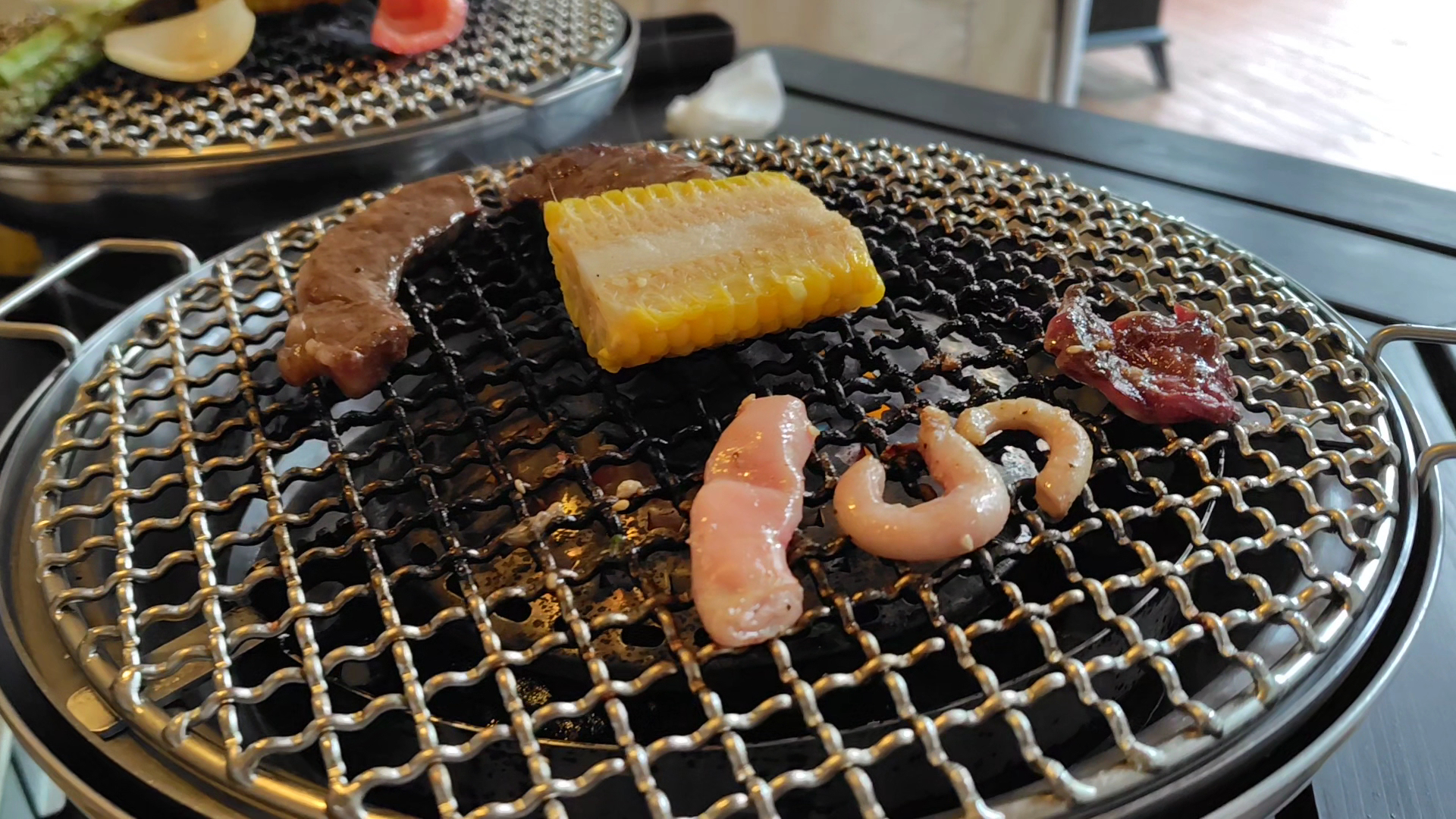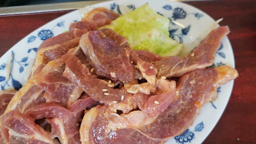 お店はジンギスカン・焼肉のお店でちょっと変わった鉄板でお肉を焼きます。真ん中に小さい鍋があってそこで野菜(キャベツやもやし)を茹でて食べるらしいです。 最初は知らずに...この鍋はなんなんだろうと思ってましたが、これを使う料理とかがあるんだろうな(しゃぶしゃぶ的な?)と思って野菜も鉄板で焼いてました。 途中から、お店の人に茹でるの嫌いですか?って言われて、茹でる?って聞き返したら...初めてでしたか説明せずにごめんなさい。ここで野菜を茹でて食べるのがこの店の特徴なんですよって謝られました。 なるほどね...自分の常識に囚われていたらだめですね。 で、茹でて食べたらほんのり塩味(塩味以外にも何か秘密がありそうな気がしますが)で野菜がうまい。最初はこんなに野菜いらないなと思っていた量の野菜はどんどん減っていきます。これはすごい。