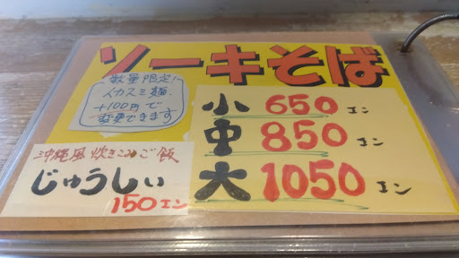 サイズですが、ソーキそば、小・中・大。タコライスは、ミニ・小・中・大・特大です。