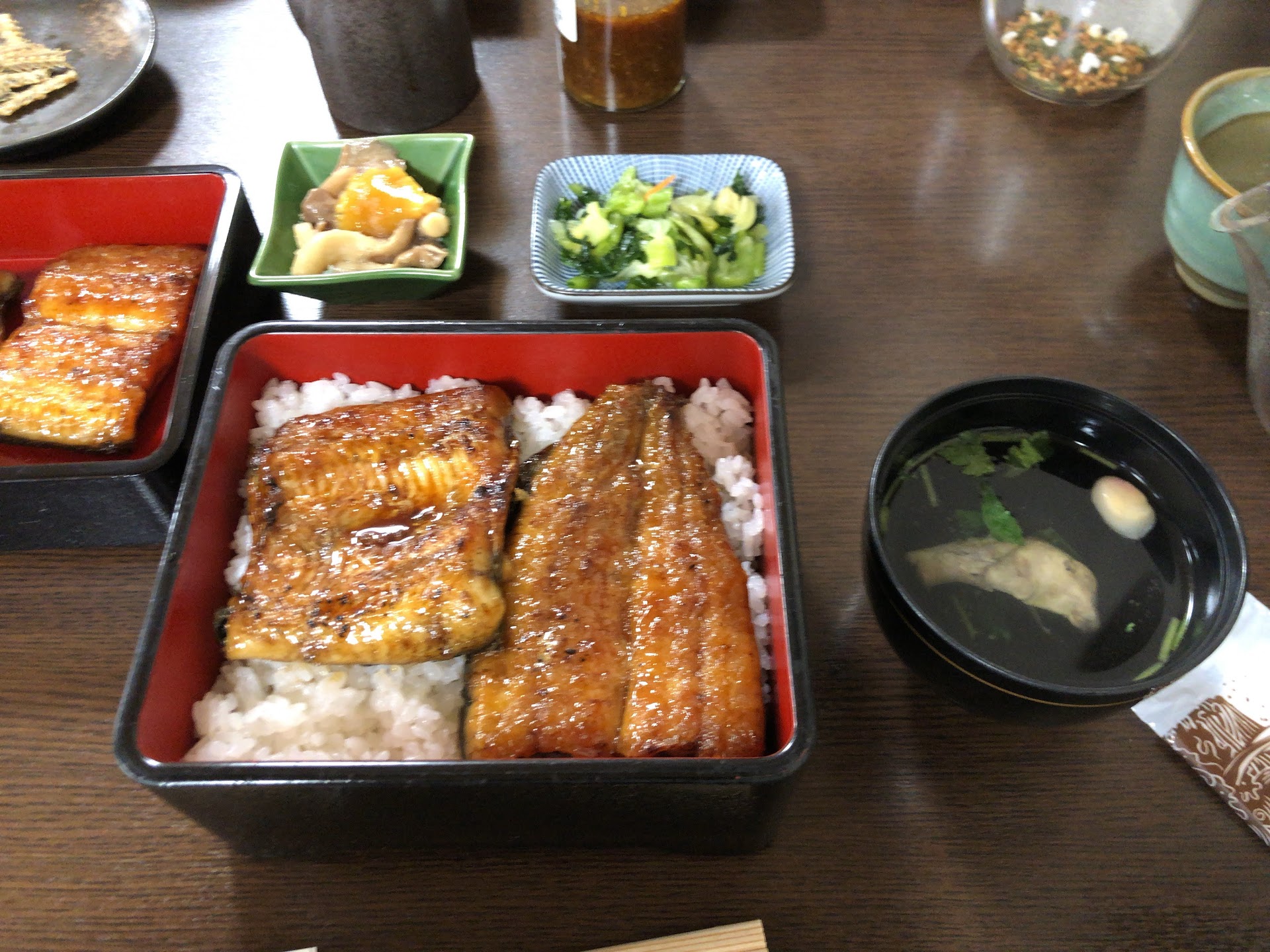 やなまぶし(丼)が変わっていてネギを細かく刻んだみじん切りとおろし山葵が1枚毎に添えられていて、両者を混ぜてタレをさらに混ぜる。それを鰻の上に乗せて食べるのだ。山葵はピリッと来る辛さと甘いものとあり、ネギはかなり細かくされているが辛味は然程感じない。甘めが特徴のタレと相まって独特の風味をもたらす。 若い夫婦はお互いのものを少しずつシェアして楽しんでいた。特にだいちゃんはここの鰻をかなり気に入ったようだ。