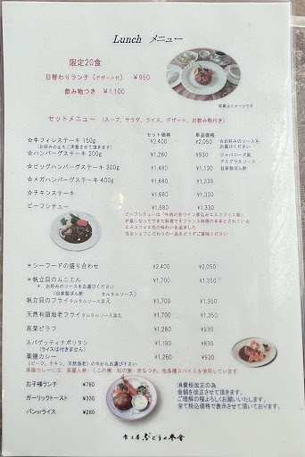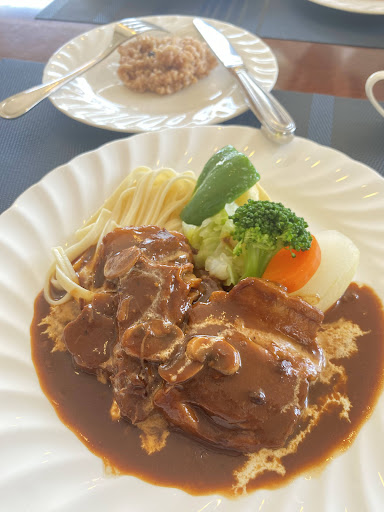 所用で岡山を訪れる予定が出来、ランチを頂けるお店を探していて高評価に惹かれて訪ねました。 駐車場は鰻の寝床タイプと言いますか、縦列駐車が基本です。軽自動車か小型車なら頭から突っ込んでも何とかなりますが、普通車以上はバックで入った方が無難です。幸い前面道路の交通量は然程多く無いです。 私は日替わりランチ(ビーフステーキ)のドリンク付き、連れはエビフライセットを注文しました。ごはんは、ライスか酵素玄米から選べ迷わず酵素玄米にしました。ふっくらと炊けた美味しい酵素玄米でした。 最初にサラダとほうれん草のオムレツと皆さん高評価のゴボウのスープが出されました。特にゴボウのスープが大変美味しかったです。 ビーフステーキも1,100円のランチメニューとしては高得点です。ソースも抜群でした。エビフライも今まで食べた中でも1,2を争う味との事でした。 デザートのプリンも滑らかで舌触りが良くカラメルも相まって美味しかったです。 機会があれば、今度はディナーを試...