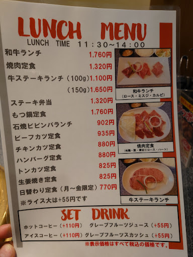 Read more平日昼間14時まで1200円で焼肉定食が食べられる。かなりの量の肉が提供される。俺はよく家族で利用する。 まずは肉の量に驚くはず。1200円にしては多い。それに比例してご飯量ある。これは嬉しい。 焼肉屋のタレ、ここはこれが美味い!マジで美味い。すりおろしニンニクをくれるので少し入れるとperfect! 昼食後にはコーヒーかジュースが撰べるので、営業しているリーマンには嬉しい(...