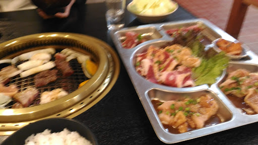 すぐに、ご飯とお肉登場。 セットは、 ・イカ(6キレ) ・野菜(玉ねぎ、キャベツ、ピーマン、かぼちゃ) ・肉(ハラミ、ロース、ミノ、ホルモン、豚ロース、鶏) ・カクテキ ・生キャベツ(サービスらしい) でした。 2~3人前とのことで、2人で食べたらボリュームは満点でした。