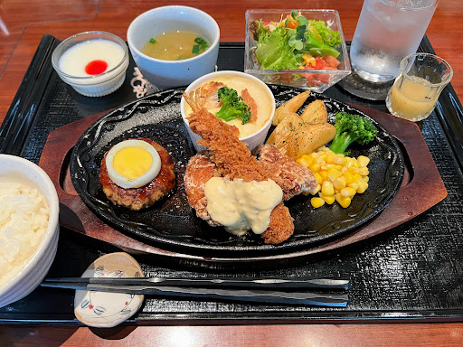 珈琲、ミックスジュース、シフォンケーキ、グリルランチ? 和風ハンバーグランチ