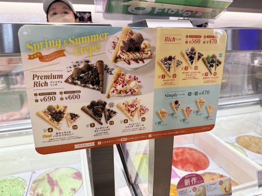 クレープが置いてあるサーティワンです。 シングルカップとクレープを注文しました。 店員さんは爽やかで愛想も良かったのですが、 クレープを受け取った時にはもうアイスがドロドロに溶けてしまっていて、クレープの包み紙の中にも溶けたアイスが溜まっていました。 折角久しぶりにクレープを美味しくいただけると思っていたので残念でした。