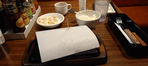 Read more私事ながら誕生日だったので贅沢してお肉を食べに出かけました。 愛想の良い店員さんに案内されて着席。 諸々説明を受けた後タッチパネルでランプ肉200gを注文。 水を一口口に含んでからサラダを取りに席を立つ。 ポテサラを取ってると手に料理を持った先程の店員さんに「お席に運んでおいてよろしいでしょうか?」と問われた。 まて!注文してこらまだ2分くらいしか経ってないぞ? 急いでサラダとライス、スープを手に席に戻る。 卓上には紙で覆われている皿が鎮座している。 紙を外すと肉の塊が二つ。 早速ナイフを入れる。 切り口は真紅。 レアだ。 なる程。 表面だけ焼いてるので提供が早かったのか。 後は熱々の溶岩プレートで好みの焼き具合に仕上げろということらしい。 まあ、試しに一口目はレアのまま食べてみるか。 うん。 表面にこれでもかと塗されている黒胡椒の力もあってレアでも食べれる。 今度は表面が色づく程度焼いて。 少し筋っぽいが気にならない。 これは当たりだ。 ・・・と、塊一つ食べ終えて気が付いた。 ソースを試していない。 3っつに別れた取り皿にガーリックオニオンソース、おろしポン酢、BBQソースをそれぞれ少量取り分けて食べてみる。 どれも悪くないが好みとしてはガーリックオニオンかな。 あっという間に食べ終わりお会計1760円。 い...