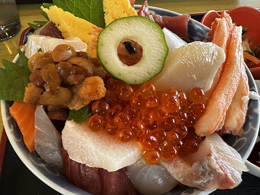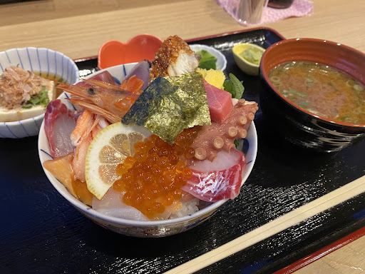 Read more店の丼をイチオシって感じで推してたので、前から気になっていました。夕方5時の開店時間に行きました。 すでに数名が店舗内に居られたので、しばらく待つことに。基本2人で店を回してる感じでした。 受付で注文した際に、3人で行きましたがテーブルに座ってたら窓際のカウンターを案内されたので何でかな?と思いました。その後来た女性2人組はテーブルに座ってたのに…。 待ち時間はまぁまぁ待ったかなといった印象でした。注文したのが海鮮丼と天丼2つで、海鮮丼が先にきて、食べ終わる頃ぐらいに天丼がくるといった感じで…。 今回注文した海鮮丼と天丼はご飯が少し少ない感じがしました。海鮮は新鮮で良かったのですが、値段の割には薄い…。海老は太くて良かったのに…。 駐車場も大きな道路沿いにあって、車を頭から入れたら道路にバックで出るようになるので危ない...