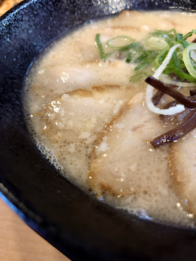 風風さんの跡地に入った一麺亭さん。 オープン初日早速行ってきました。 流石初日とあって駐車場は満杯。たまたま一番手前だけが空いていたのでなんとか突っ込んで店内に。 長いカウンター席の手前と奥にテーブル席が数卓。内装は風風さんの時と全く一緒。所謂居抜きってやつかな? 数人の待ちがあったがのんびりスマホを見ながら時間を潰す。 こちらにどうぞ 通されたのは6人は座れそうなテーブル席。 ソロなのにいいの? 遠慮してたら店員のオッチャン(もしかして店長さん?)がニコニコしながら大丈夫ですと案内してくれたので恐縮しながら着座。 豚骨ラーメンとライス、餃子を注文 品が来る前に席を立ち本棚横の漬物コーナーへ。 高菜と紅生姜が用意されていたので高菜を少しいただいて席に戻る。 注文から4分程でラーメン到着。 ビジュアルもスープの薫りも正統豚骨ラーメンって感じ。 早速スープから。 熱い! やはりラーメンのスープはこうでなくては! 味も悪くない。 ガッツリした味を求める人にはやや物足りないかもしれないがかなりレベルは高い。 そして麺。 固めでお願いしておいて正解。 私好みの固さ。 ズルズルと音を立て次々と口内に納まっていく。 まずいな、このペースだと餃子が来る前に食べ終わってしまうぞ。 と、心配した矢先ラーメンに遅れる事3分で餃子到着。 見事な羽つき餃子。大振りなのが6p。 さてお味は? これも美味。 タレを使ってないのにラーメンの味に負けてない。そして何より熱々! 結局餃子はタレを全く使わないで食べ切りました。 そうそう、高菜。 最初はラーメンの味変にと思ってたんだけど白米のお供に最適すぎてスープに浸る事はありませんでした。 次回は胡麻や胡椒、高菜、紅生姜等で...
