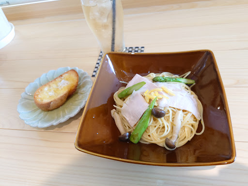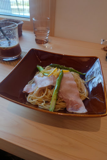 本日のパスタは「ローストポークと柚子胡椒のパスタ」、薄切りのローストポーク・しめじ・アスパラガス、上にはしっかり柚子がのっています。胡椒もしっかり効いており、メリハリのある味わいでした^^