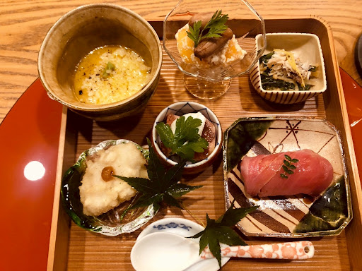 The meal started with an otoshi that was more like a full appetizer platter — and an impressive one at that. There was a soup made with local farm cheese, persimmon with tofu dressing, figs mixed with cottage cheese, tempura of pike conger, and a piece of tuna sushi. Every single dish was spot on; I could’ve easily had two drinks just with that.