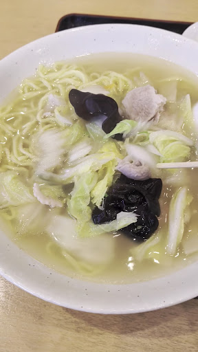 店舗外まで並ばれていた他の方が順番が来たようで、着席されていきます 更に待つと五目汁そばがやっと配膳されました 白菜、豚肉、海老、筍、木耳の五目と、優しい味のスープ。麺は茹で過ぎ感がありますが、味覚は美味しいと感じられたけど素直に食事を愉しめる気にはなれませんでした