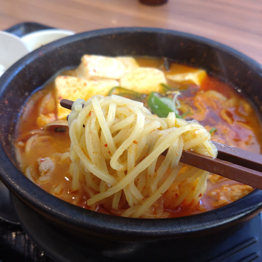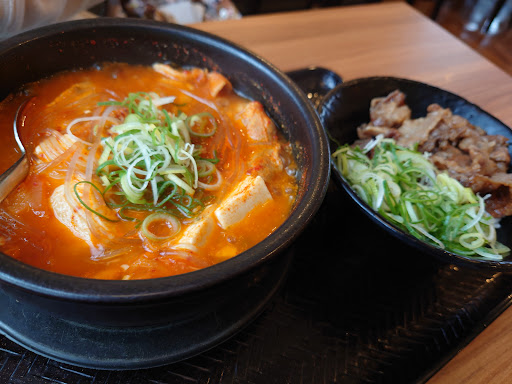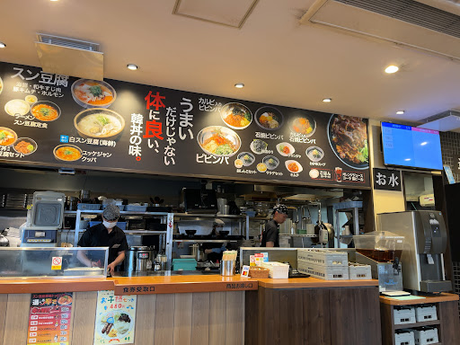 Read more平日の夕方にテイクアウトで利用しました。 駐車場は店舗の奥にあり、旧2号線からでも側道からでも入れます。駐車台数は16台。ランチタイムの込具合は分かりませんが、平常時間であれば満車で停められないことは無いと思います。 店舗入口は駐車場側と旧2号線側の2箇所です。店舗に入ると、テーブル席とカウンター席があり、先に食券を買うシステムです。食券券売機は旧2号線側入口の横に1台あり、支払いは現金のほかQRコード決済、クレジットカード決済に対応。 今回は新聞チラシに誘われ、初めての利用となりました。注文したのは、チラシにあった期間限定の博多モツ鍋スン豆腐単品(800円)、そしてレギュラーメニューから、温玉カルビ丼(740円)、ホルモンスン豆腐単品(710円)を購入。5分程度でテイクアウト出来ました。韓丼はネットでの事前注文も可能ですが、混雑時の時間帯で無ければ、来店後での注文でもそれほど時間はかかりませんでした。 お料理の味ですが、温玉カルビ丼は米の硬さも絶妙で、温玉との調和のとれた美味しさで、ホルモンスン豆腐もピリ辛で美味しかったです。期間限定のモツ鍋スン豆腐ですが、こちらはスープの色とは裏腹に結構辛い味でした。辛口が好きな方にはおすすめです。 残念な点は2つ。一つは期間限定のモツ鍋の価格がチラシと実販売は違っていたこと。(実販売の方が高かった)もう一つはスン豆腐のテイクアウトはスープがこぼれやすいことです。牛丼類と違いどんぶりパックにスープが入っているので、注意して運ばないと結構溢れます。 でも味は良かったので、次回は店内での...