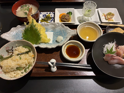 お昼前に行きました。 メニューは和食定食のみです。 具沢山のお味噌汁 お刺身 サクサクの天ぷら 炊き込みご飯か十六穀米やったかな選べます。 この日は山菜の炊き込みご飯でした。 おかわり出来ますと言われたので無料でしょうか。次回行く時はしたいです。 どれも美味しかったですが小鉢が一口サイズなのでもう少し食べたいなと思いました。 テーブルに置いてあったポットが動物柄で可愛かったです。 店内は落ち着いた雰囲気で良かったです。