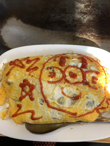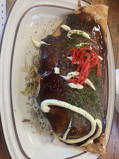 肝心のお好み焼きですが、 オムレツのようにくるんであるような… 広島風?キャベツは細かい千切り、ネギが少々?かな。 生地はクレープのようでした。もちもちしています。これは好みが分かれそう。