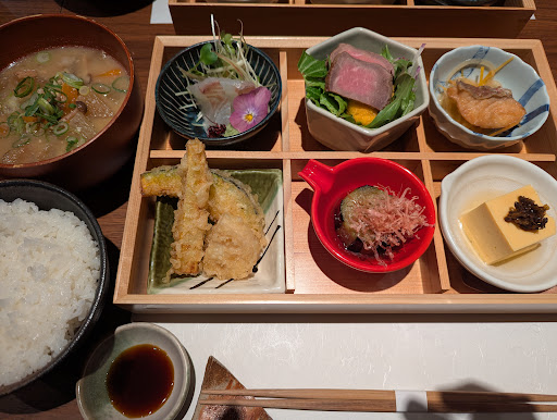 Read more金曜夜に、和食が食べたくなりフラッと利用しました。メニューは肉・魚・ご飯物等と満遍なく、特にお野菜に力を入れられてるようでした。色々な小鉢がセットになった御膳があり、事前予約も不要だったのでこちらを注文。小鉢6種(刺身・ローストビーフ・鮫の竜田揚げ・野菜の天ぷら・ナスの煮浸し・卵豆腐)+〆に稲庭うどんが出てきて3000円くらい?でめちゃくちゃお得感がありました。 何より、一品一品が本当に美味しい…!!特にお野菜の天ぷらが絶品だったので、野菜の天ぷら10種盛りを追加注文。衣はサックサクで食べた時の口当たりが最高!お野菜自体の甘さが味わえて、こんなに美味しい天ぷらに久々に出会いました。 だし巻きも追加で注文したのですが、なんとたっぷりのあんかけタイプ!やさしい出汁の効いたあんがびっくりするほど美味しかったです。 ソフトドリンクも注文し、2人で計9000円程でした。お手頃な価格でこんなに優しく手の込んだ和食を食べられて感動しました。土鍋ごはんやプリン等、まだまだ他に気になるメニューがあるのでま...