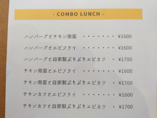 Read more初めてお邪魔しました。 気になっていたお店です。 昼開店の一番に入店。 COMBO LUNCHメニュー ハンバーグとぷり海老カツ 目玉焼きトッピングをオーダー。 サラダとスープも付いてます。 ご飯もお代わり自由。 いい内容だと思います。 海老カツは名前の通り プリプリです。 タルタルソースもたっぷりで タルタルソース好きにはたまりません。 ソースもおいしかった。 ハンバーグもしっかりとした大きさ ハンバーグは3種類のソースから選びます。 デミグラスソースにしました。 ハンバーグには目玉焼き。 トッピングして正解。 COMBOメニューですが、それぞれ しっかりと量があるので大満足。 おなかいっぱいです...