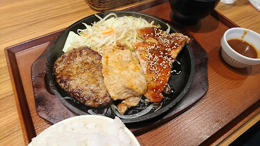 欲張りミックスグリル 899円 120gハンバーグ、ポークグリル、 チキンステーキの3種類 この中ではチキンが旨かったなぁ