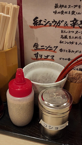 Coming in to Okayama for a short transit before heading to Kurashiki, we found this basement outlet near the station. Nondescript but we were about the only tourists at 2pm. There was a constant stream of locals coming in, n queuing to get in. Limited seating for about 10 pax, you first order your meal via the self- service kiosk. You know it's mostly for locals becos it was only signed in Japanese. A kind gentleman helped us figure out the diff options. Insert your money first then press your choice. Take your ticket and the little lovely lady will direct you to 2 seats at the front corner of the store. Turnover is fast n we waited about 5 min. All counter seating. Your food is served pretty quick. Very efficient kitchen work. Use the garlic press if you like garlic in your food, they serve up freshly peeled garlic at the counter, DIY. If you want to add on other food items, you can order over the counter n pay where you are.