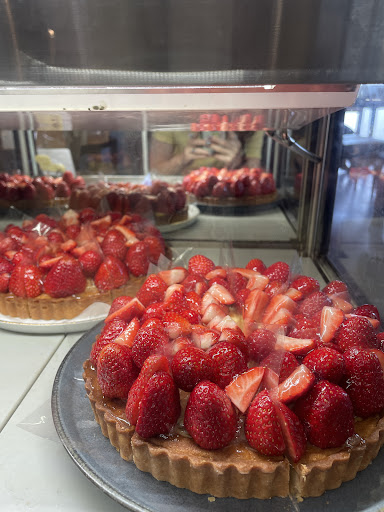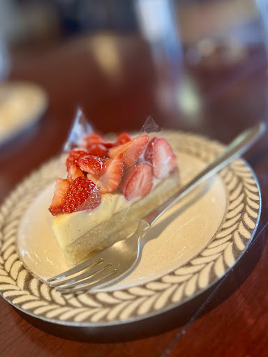 入口すぐのショーケースに大ぶりのフルーツが乗ったタルトとプリンが陳列されているので、ついデザートも頼んでしまいます。この日は苺の季節だったこともあって、2種類のケーキがどちらも苺で、ちょっと選び甲斐が無かったですが、大きな新鮮な苺に甘すぎないタルトで美味しかったです。季節によってフルーツが変わるみたいなので、また違う季節にも行ってみたいと思いました。