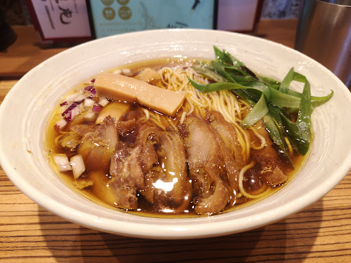 市内にあるお店の系列店です。 まだまだ人気が高く、開店前でも並ぶかと思います。 注文は笠岡ラーメンを謳っているので、迷わず生醤油のラーメンを選択。 笠岡ラーメンは名店からあまり知られていないところまで試したことがあり、住まいから比較的近いところで味わえるのはありがたいです。街中にもいくつかありますが、アクセスが難しいですよね。 さて、肝心のラーメンですがイメージ通りでした。 笠岡ラーメンの平均的なところから比較すると、岡山寄りのアレンジが加えられています。 麺は人気店ではおなじみとなった富士麺ず工房が使用されているとのことで、安定感があります。 鶏チャーシューは面白いですね。笠岡タイプで言うとややタンパクというか、パサっとしたものが多いですがこちらのものはかなりジューシー。やや照り焼きのような風味も感じます。 メンマもかなりしっかりしたものがトッピングされており、具材へのこだわりを感じました。こちらもちょうど良い歯ごたえで旨みがぎっしりとした食感。 アクセントでレッドオニオンも彩りと次第に味変になるようですね。味変では香味唐辛子の赤を勧められましたが、やや好みがわかれるかも知れません。ややエスニックな雰囲気に変わります。 やや残念だったのはスープでしょうか。最初はかなり甘めのスープ?と思っていました。たまたまかもしれませんが、しっかり混ざっていなかったようで最後の方に笠岡ラーメンを思い出すような味が出てきました。底に溜まっていたんですね……再度リベンジしたいと思います。総じて大変満足なラーメンでオススメです。 ラーメン以外にも鶏料理が豊富で、夜にはお酒も変わったものが揃っているようです。リピート確定の麺処でした。