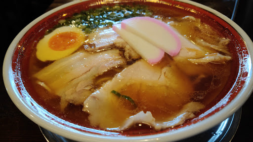琥珀色のスープはとても澄んでおり、スープの中を泳ぐ細麺がしっかり見えます その上にはかまぼことゆで卵がちょっと居心地悪そうなくらい、チャーシューが敷き詰めてあります