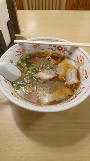 スープは昔ながらの醤油豚骨、醤油がかなり前面に出ており塩分濃度はかなり高いです。岡山ラーメンの甘さはなくご飯が欲しくなる味わいですね^^; 麺は中細ストレート、デフォで若干軟いです。チャーシューはバラ肉より少し厚めの中サイズが3枚、他の具材は細シナチクと青ネギです。