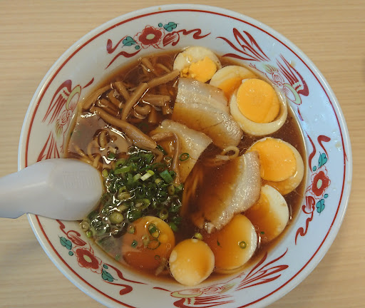 ラーメン 道です。 ラーメン特集か 何かの記事で 雑誌で見つけて写真が美味しそうに見え、 友人を誘い来ました。 夕方、6時頃に 二人で伺いました。が あれ、駐車場に スペースがたくさんあります。 この時間帯で? 不安に成りつつ 入店 何処えでも 座れるようです。今日は寒いので入口辺りを避けて 真ん中辺りの席を選びました。 メニュー数の多い中より、醤油ラーメン2つと鳥の唐揚げ 餃子を 注文して待ちます。 お客様が、次々と来店されるなか、しばらくして、 まず醤油ラーメン590円が 2つ運ばれ来ました。 直ぐに、唐揚げ480円 餃子300円が運ばれて来ました。 ラーメンがきて あれ ラーメンをすかさず食べます。 うっ やっぱり、胡椒を2~3ふり ラーメンをすすり上げ勢いよく 食べました。チャーシューは脂身がやや多めでも、旨い。 合間に 唐揚げをかぶり付き、あちっ さすがに揚げたて、 餃子も、辛子と辣油の入った酢醤油に かぶり付き...