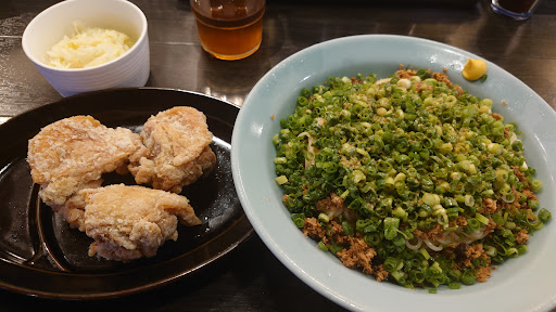 冷やしなので通常よりも少し待ちます... 暫くして着丼! ネギまみれです!(笑) チャーシューの細切れと小口切りのネギが具のようです🤣 1口啜ると...酸っぱ!(笑)少し酸味が強めです。ゴマ風味のタレみたいです 味はハッキリとしない微妙な感じ... もちろん個人的な感想なのでご理解を! 麺は冷たく締まって美味しかったです😋 Bセット(唐揚げ3個➕コールスロー)にしたので➕250円 唐揚げは揚げたてでとても美味しかったです。コールスローも普通に美味しい 冷やし中華は私には合わなかったけど、次は名物...