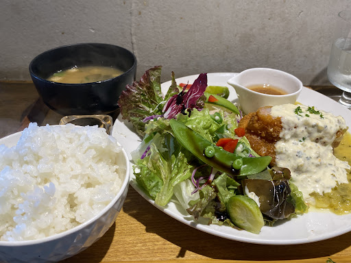 Read more一階が駐車場になってます♪ 駐車場は8台ぐらい停めれます! 狭いので要注意です! 階段を上がり店内へ✨ 店内は広く座れる席数は多かったです! 2名テーブルが多かったです♪ お水はセルフとなってます! お水はデトックスウォーターがあり、 竹炭、レモン+ミント、ミント&清美オレンジの三種類♪ 今回は『海老カツレツ』にしました! 全ての料理に44円プラスで+ベジができます! せっかくなので、 海老カツレツに+ベジでオーダーしました! ご飯は大中小と選べるので 今回野菜を多めにしたので中で!笑 料理をオーダーした後、まず食前にトマトジュースが出てきました♪ 海老カツレツはエビがたっぷり入っていて美味しい!ソースがかかっているので衣は少ししっとりしているので、より海老のぷりぷり感を感じる事が出来ます♪ ソースは酸味のあるタルタルレモンソースがかかっているので、 揚げ物でもさっぱりと食べれました♪ 野菜は色んな種類が沢山入っていてとても健康的なサラダでした! お味噌は煮干しで出汁をとっていて煮干し出汁の風味がよく出ていて美味しかったです♪