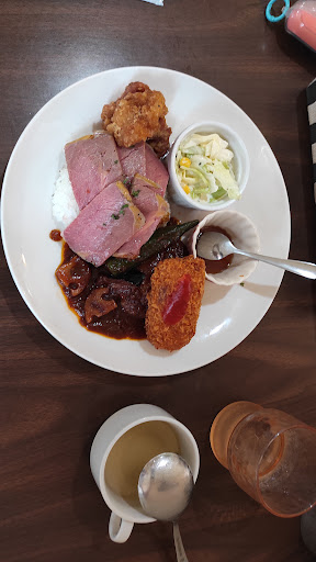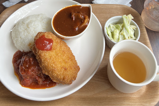 料理は厨房で男性が作っていたので、女性店員とは関係ありませんが… 彩はパッとしないし、付け合わせのキャベツのコールスロー的なのは無味でほぼキャベツ。 コンソメスープは具材なしの濃いめの汁。 プレートの料理はすごく美味しい!より、あ!うちでもハヤシライス作ろう〜!と思うくらいのレベルです。夫は+50円で大盛りにしましたが、元々が多くないので普通の量でした。