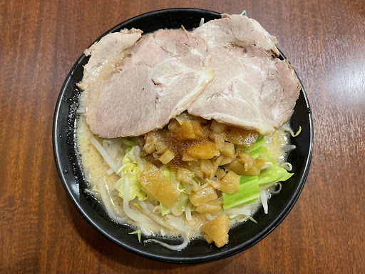 Read more専用駐車場があります。 店内は広くて席も多めです。 最初に食券を買って、席に付いて店員に 渡すシステムになります。 今回は18時以降で10食限定の 家系×二郎ハイブリッドラーメンを頂きました。 並200gか大盛り300gか聞かれます。 麺の量が変わっても値段は同じです。 またトッピングはニンニクの有りか無しか 答えるだけで、にんにく、野菜、背脂の量を 増やしたりすることはできません。 麺の硬さは選ぶことができます。