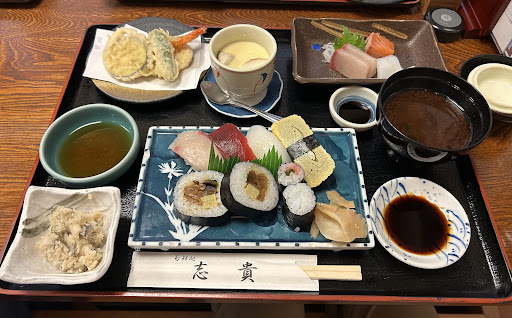 Read more主人が行ったことがあるからと連れて行ってもらいました。日曜日の昼のランチタイムでかなりお客さんが入ってました。店内はテーブル、カウンター、小上がりもあって賑わっています。11時開店と同時にお客さんがぞろぞろ入って行きましたが食事が済んだら帰るのか長居しない感じです。ゆっくりしてもいいんでしょうけどリピートのお客さんが多いからか場の雰囲気を見てササッと帰るのかまったく待たずに席に案内してくれました。大将がカウンターで仕事しながらお客さんの出入りを見ていてスタッフに誘導するのが上手。 食事はというと志貴ランチ?ちょっと忘れましたが色々入ってるのを頼みましたが、 どれもきちんと職人さんの味で最高でした⭐️ お盆に乗った内容もバランス良くて小鉢、赤出汁の味噌汁、連子鯛?の煮付け、お刺身3点盛り、海老などの天麩羅、ご飯です。 あまりに美味しくて黙々と食べるほど。 私は魚食べるのがうまくありませんが、綺麗に食べれました。 一つ主人はご飯をもっと食べたかったけどおかわり100円でした。以前はタダだったと言ってました。でも、このご時世に100円でおかわりは頑張ってると思います。 ご飯も美味しくおかわりしたくなりますが。 帰る時もごちそうさまですしたらこちらを見て挨拶してくれていたのが良かったです。 これからたまに休みに...