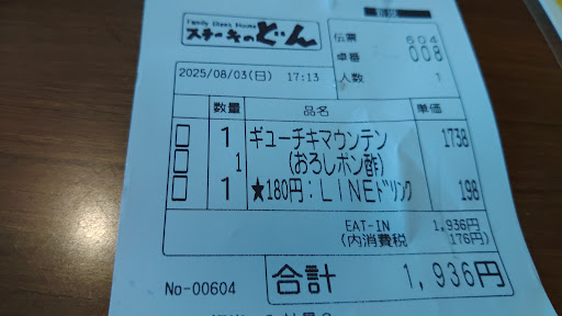 1500~2500のメニューが占めているかなと思います。 写真のメニューはミックスグリルコンボになります。 大衆レストランの中で考えるとお値段は少し高めで安く食べたい方には不向きかなと思います。 他社批判ではなくあくまで個人指標として捉えて戴けるならミスター◯ー◯さんのほうがお安く食べられるし大衆感もある。大衆レストランの中ではステーキのどんは少し高級なお店と思って頂けたらわかりやすいかなと。