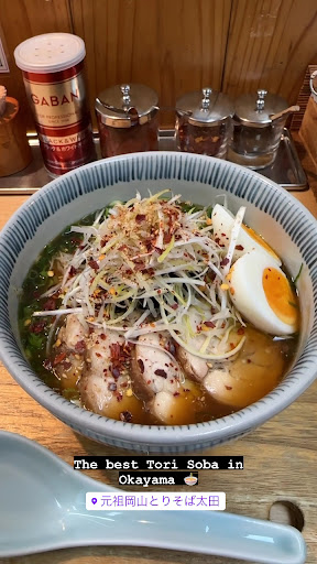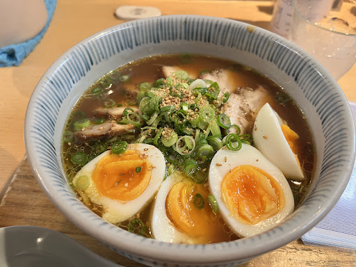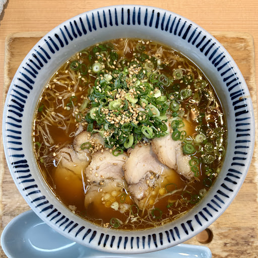 Thin soba noodles in soy or salt-based soup, topped with sliced chicken & egg or pickled plum.