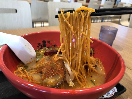 昼食で利用した。 食事コーナーは、横広に設置されてる関係では、広さはある様に見えるが、連休に人が溢れる時期には、到底追いつけない気がした。 この時は、平日11時と早い時間帯だったので、席は、ガラガラでした。 夏メニューで、赤鬼ラーメンというのがあり、物珍しい衝動に駆られて購入した。 出汁は、豚骨風の白いスープに唐辛子🌶️1本載せて辛さをアピールしてます。 ちょっと驚いたのは、麺が赤く🟥染まっている唐辛子を練り込んでいる様だ。 期待をしながら食するが辛さが際立つと言う事は全く無い。むしろ、この混ぜ込みのせいなのか麺の腰もなく粉っぽさが残る。→最悪なコラボ。 一元客は、あったとしも次は無いと感じた...