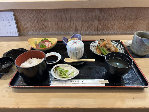 注文は魚八定食(864円)、待つこと10分弱で配膳、握り鮨・巻物・うどん・デザートの構成です。握りは4貫でネタは大きめ、シャリは若干軟らかいでしょうか、赤身とだし巻きが好みの味わい。胡瓜巻きは3貫でこぶりなサイズです。