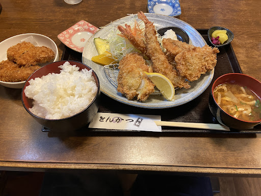 料理 メニューを見て思わず海鮮盛り合わせ定食⁇を注文。 大きなエビフライ2本、ホタテも驚くほど大きい。白身フライ2つもついて1000円ちょっとは安すぎませんか‼︎