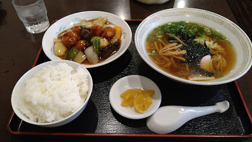 Read more厨房と客室面積が等しい感じの、町中華店です。 入って正面と左側が客室エリアで、右側がカウンター席3席くらいと厨房です。 セットメニューのラーメンは、醤油ラーメン1択です。 今回は、酢豚セット(税込1050円)を選択しました。 先ずはラーメンからいただいたのですが、具材は長葱、かまぼこ、細メンマ、ワカメの4種に中細?麺の組合せ。 肉は、無い。 麺は柔らか目に茹でており、ほのかに甘酸っぱい感じ。 コレは味付けメンマの影響なのか、酢豚のタレが混入したのか? 酢豚は悪い例えだけど、夏の暑さで液垂れしている油性ボールペンかって位、粘り気のあるトロミダレ。 そして甘党大歓喜なくらい、甘味が強い。 でも、パイナップルは入ってません。 もしかして、醤油ラーメンの甘酸っぱい感じは、このトロミが混入したのではないだろうか。 名鉄の駅舎斜向いという好立地ではあるけど、普通列車がメインの駅だから、繁盛している...